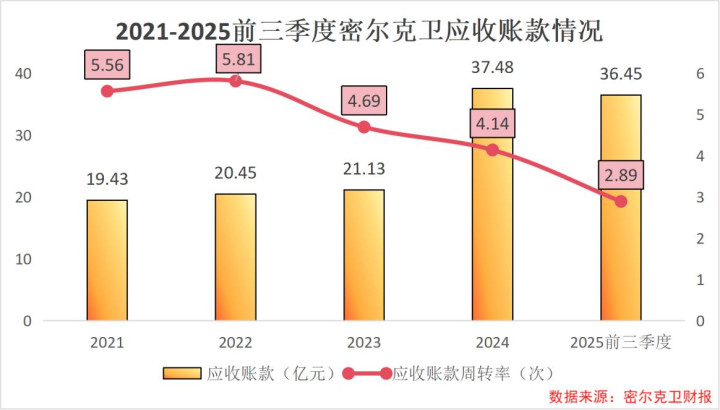 2025年前三季度公司应收款项达到36.45亿元,占全部总资产的18.48%。应收账款周转率从2021年的5.56次下降到2025年前三季度的2.89次,周转次数减半。