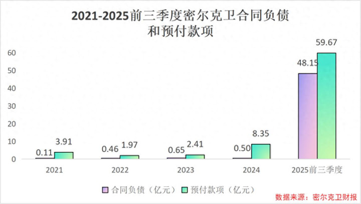 2025年前三季度,公司合同负债达到48.15亿元,同比大增2562%,与此同时,预付款项达到59.67亿元,同比增长1007%。