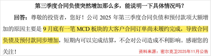 对于合同负债激增的原因,密尔克卫给出的解释是由于9月底一笔MCD板块的大客户合同订单尚未履约完成,致使合同负债和预付款项增加。
