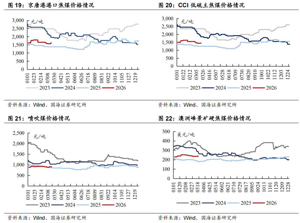 本周CCI低硫主焦煤价格环比上涨:截至3月20日,CCI柳林低硫主焦(含税)为1450元/吨,周环比上涨10.0元/吨。