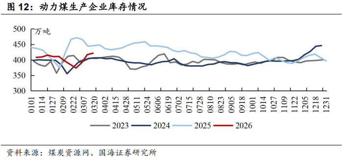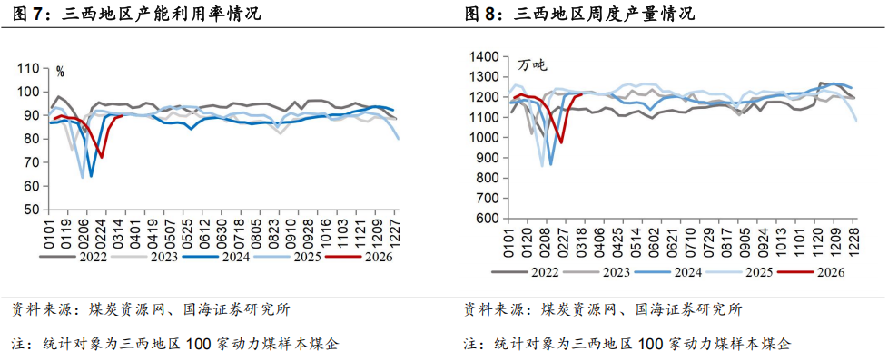 本周山西、内蒙古、陕西坑口价格分别环比上涨、上涨、上涨:截至3月20日,大同南郊弱粘煤(Q5500)坑口含税价为593元/吨,周环比上涨8元/吨;鄂尔多斯Q5500动力煤坑口含税价为536元/吨,周环比上涨5元/吨;陕西榆林神木Q6000动力煤坑口含税价为619元/吨,周环比上涨17元/吨。