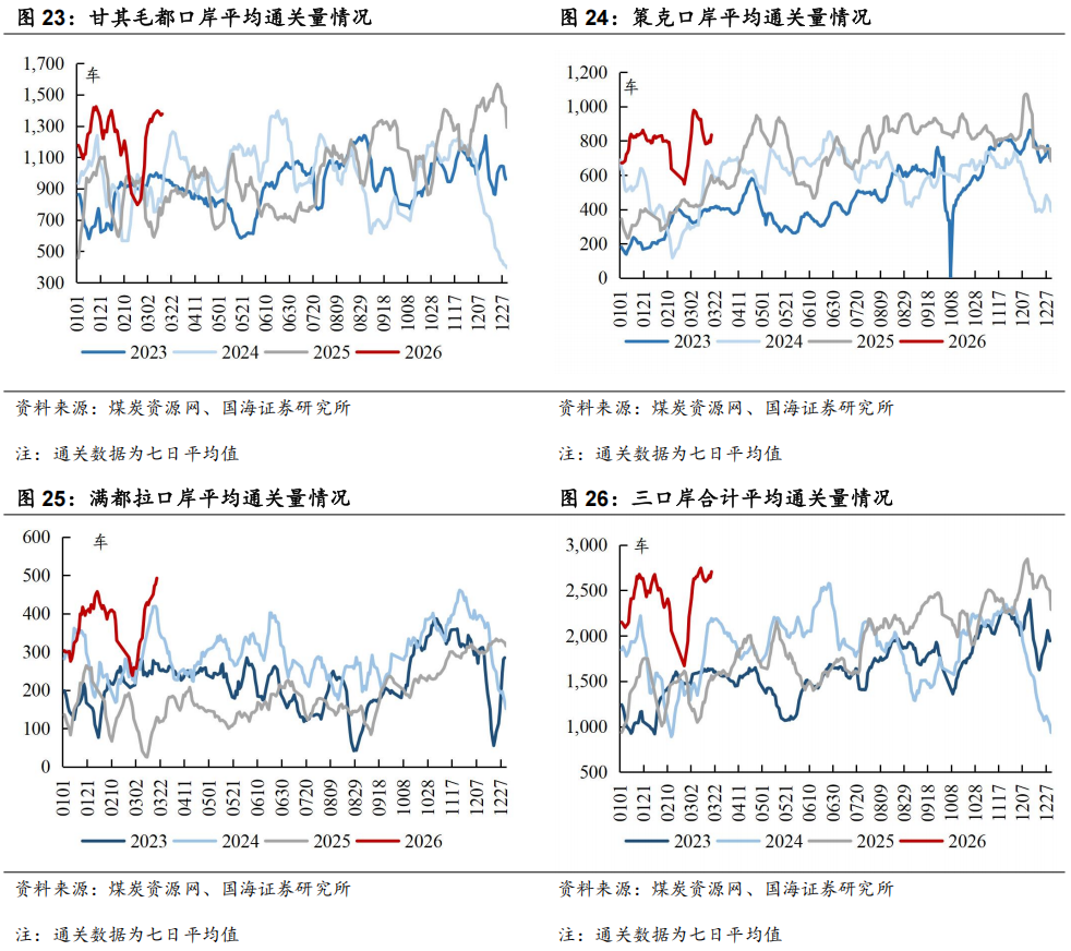 本周甘其毛都口岸平均通关量环比上升:截至3月19日,甘其毛都口岸平均通关量为1379车(七日平均值),周环比上升1车。