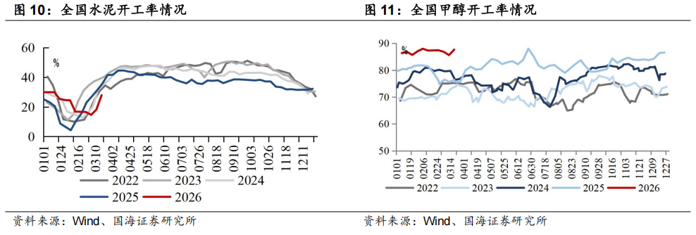 本周全国甲醇开工率环比上升:截至3月19日,全国甲醇开工率为87.7%,周环比上升2.1pct。