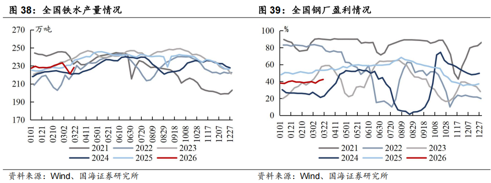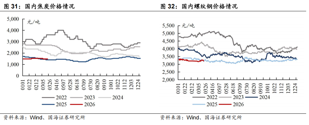 炼焦煤和焦炭来看,对于炼焦煤,本周样本煤矿产能利用率周环比+1.49pct至87.2%,主要系部分因重大会议延迟复产的煤矿开工继续恢复。蒙煤方面,本周保持高位运行,本周甘其毛都平均通关量为1379.1车(七日平均值),周环比+1车。需求端,本周铁水产量周环比+7.05万吨至228.20万吨,主要系近期北方高炉复产,焦化补库需求亦有一定释放。库存端,本周焦煤生产企业库存周环比-15.69万吨。整体来看,供给端,煤矿继续复产、蒙煤通关车数维持高位。需求端,两会结束后高炉复产、铁水正常爬升,下游焦化厂受期货盘面上涨影响释放部分补库需求。焦煤矿山库存环比去化,截至3月20日,港口主焦煤价格1,620.00元/吨(周环比+50.00元/吨),短期来看受海外能源高位运行及动力煤价格止跌回暖影响,焦煤能源属性交易或高于基本面影响。后续继续关注原油和动力煤价格、以及焦煤自身供需及下游对价格接受度等情况。对于焦炭,供给端,两会结束后前期限产焦企逐步复产,叠加近期焦炭利润向好之下少数企业生产积极性提升,本周焦企产能利用率周环比+0.32pct至74.43%。需求端,本周铁水产量周环比+7.05万吨至228.20万吨。库存端,多数钢厂对焦炭以按需采购为主,但两会结束后钢厂高炉开始复产,焦炭日耗回升,本周独立焦化厂焦炭库存周环比下降。整体来看,本周焦炭价格持稳运行,市场存1-2轮提涨预期,后续关注两会期间钢焦生产变动以及上游煤价情况。