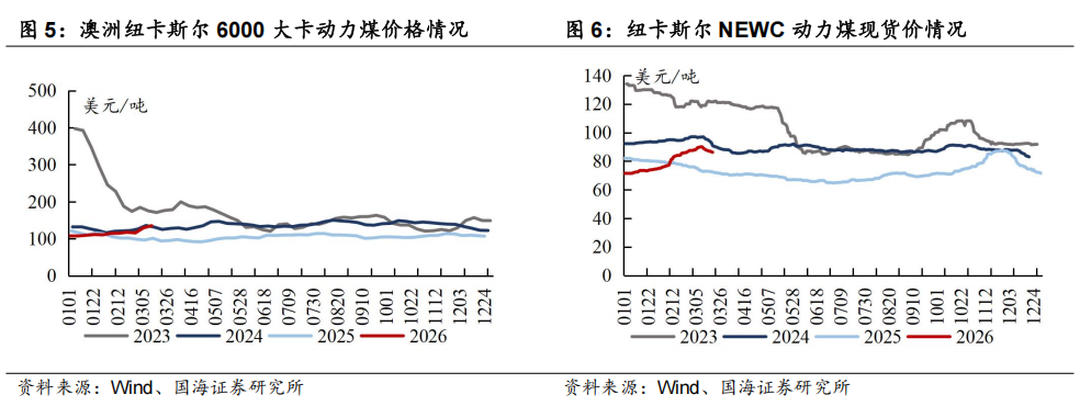 截至3月13日,国际6000大卡动力煤价格环比上升,本周国际5500大卡动力煤价格环比下降:截至3月13日,纽卡斯尔6000大卡动力煤价格为135.14美元/吨,周环比上升5.6美元/吨;截至3月19日,纽卡斯尔5500大卡动力煤(2#)价格为86.25美元/吨,周环比下降1.7美元/吨。
